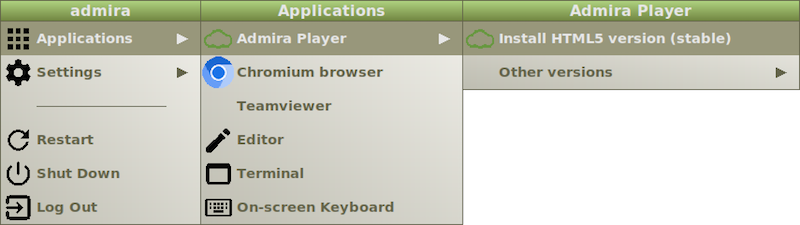 When the installation process ends, the system automatically starts a customized and lightweight desktop environment containing just the required packages to install and run the Admira Digital Signage Player.