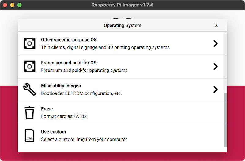 First, choose one of our custom image files based on your needs. Then, open the Raspberry Pi Imager: