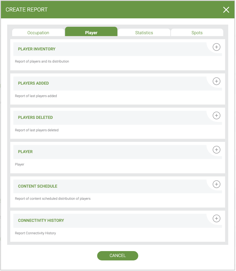 Statistics: Collects content broadcast passes and advertising campaigns. This type of report requires prior activation of statistics collection, available from the Admira SaaS BUSINESS License. It is possible to activate it on the entire circuit or only for a particular group of players.